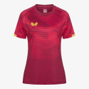 Czerwona koszulka ze złotymi detalami i o kobiecym, taliowanym kroju. Wzór na przodzie koszulki i rękawach, gładki tył. Wykonana z komfortowego i elastycznego materiału. Tworzy stylowy komplet z pozostałymi elementami kolekcji Puro.