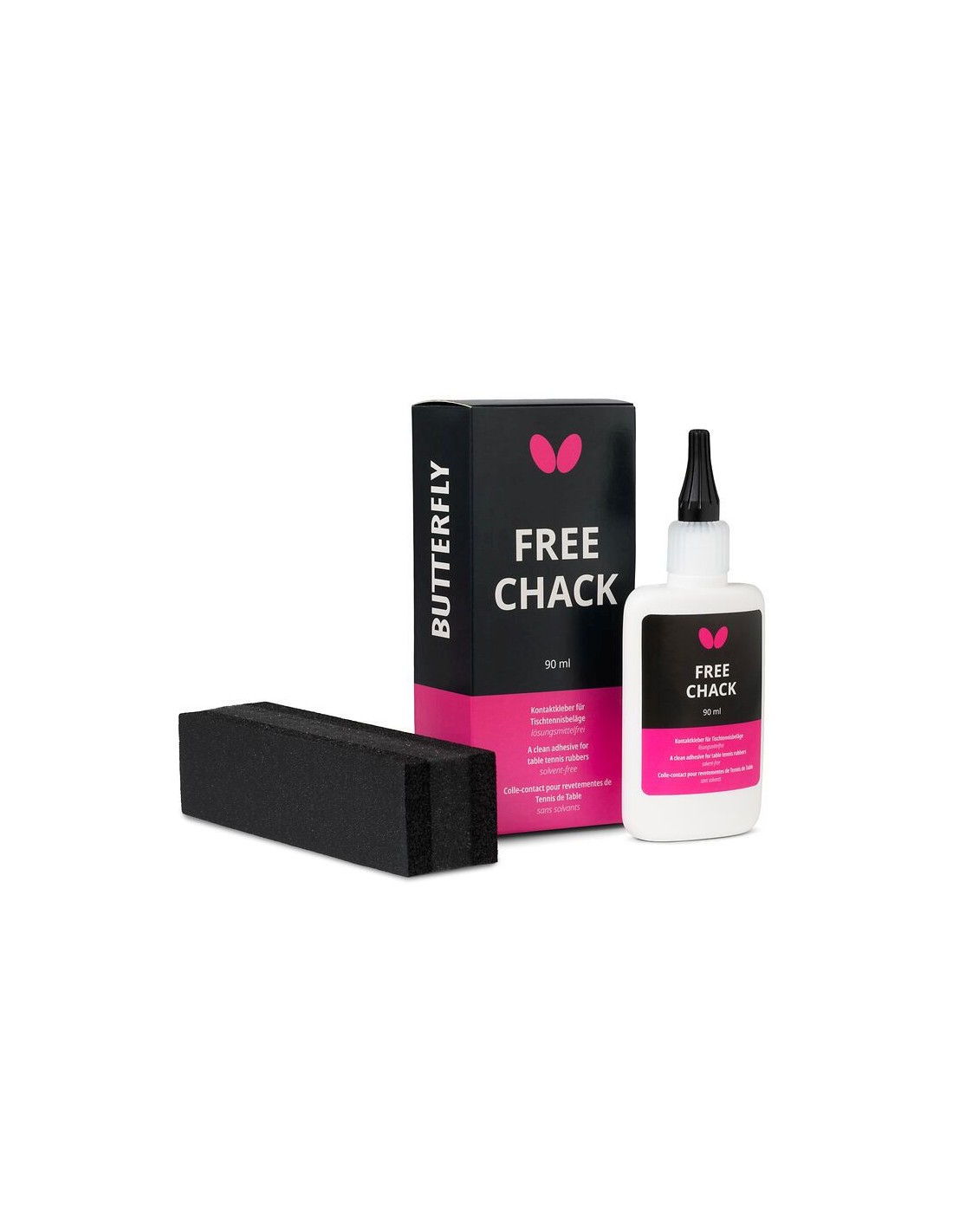 Klej Free Chack jest pierwszym w ofercie Butterfly klejem, który nie zawiera rozpuszczalników organicznych. Jest wytwarzany ze 100 % płynnego kauczuku zgodnie z nowymi przepisami dotyczącymi klejenia. Idealnie skleja okładzinę i deskę. Umożliwia łatwe odklejenie okładziny od deski gdy zajdzie taka potrzeba i jest łatwy do usunięcia z powierzchni podkładu. Sprzedawany w zestawie zawierającym 16 gąbek. Pojemność 90 ml.