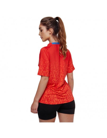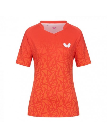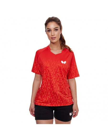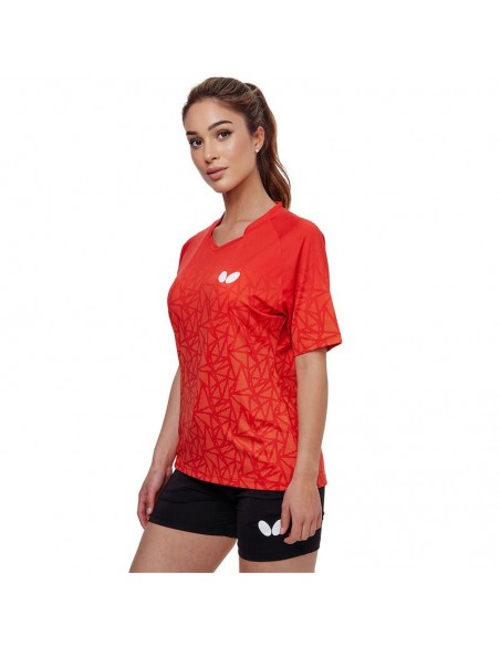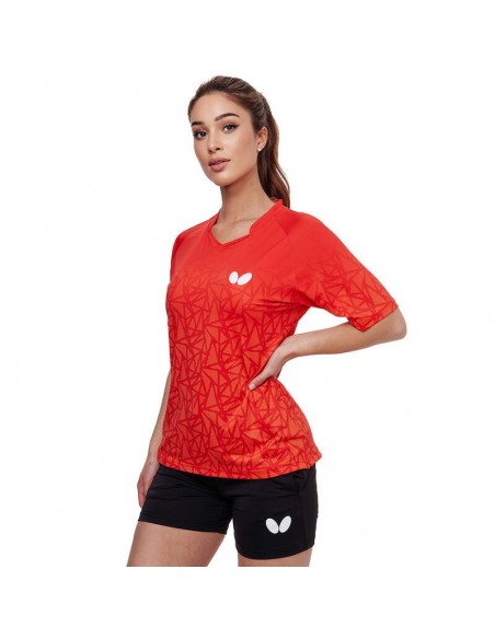 Damska czerwona koszulka z kolekcji Higo, która została zaprojektowana w ścisłej współpracy z najlepszymi zawodnikami Butterfly, takimi jak Timo Boll, Dimitij Ovtcharov czy Patrick Franziska. Celem było opracowanie takich ubiorów, które spełnią określone wymagania tenisistów stołowych. W efekcie powstała kolekcja o węższym kroju, krótszych rękawach (koszulki), uszyta z cienkiego, elastycznego i komfortowego materiału. Ubrania te mają zapewniać swobodę ruchów, a ich profesjonalny charakter podkreśla oznaczenie PRO umieszczone z tyłu koszulek. Dobór kolorystyki, materiału i wzornictwa odzwierciedla preferencje gwiazd Butterfly.
