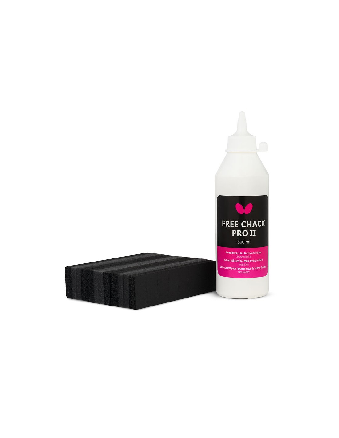 Najnowsza wersja kleju FREE CHACK PRO, którego konsystencja został zoptymalizowana. W efekcie otrzymano klej, którego czas wysychania jest znacznie krótszy, a okładzina jest sklejona z deską w 100% swojej powierzchni. Zapewnia to wydłużony kontakt rakietki z piłką i wsparcie nadawanej piłce rotacji zaraz od momentu sklejenia rakietki. Sprzedawany w biodegradowalnym kartonowym opakowaniu wraz z kompletem gąbek.