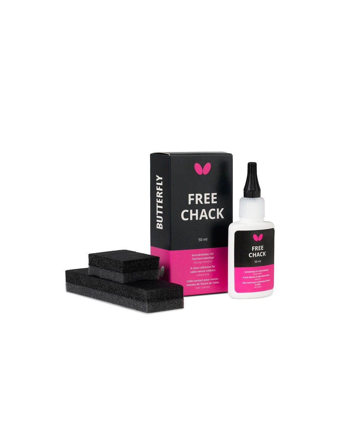Klej Free Chack jest pierwszym w ofercie Butterfly klejem, który nie zawiera rozpuszczalników organicznych. Jest wytwarzany ze 100 % płynnego kauczuku zgodnie z nowymi przepisami dotyczącymi klejenia. Idealnie skleja okładzinę i deskę. Umożliwia łatwe odklejenie okładziny od deski gdy zajdzie taka potrzeba i jest łatwy do usunięcia z powierzchni podkładu. Sprzedawany w zestawie zawierającym 10 gąbek. Pojemność 50 ml.