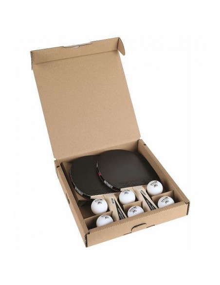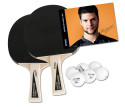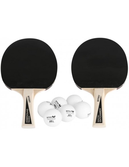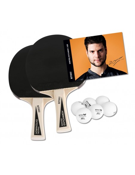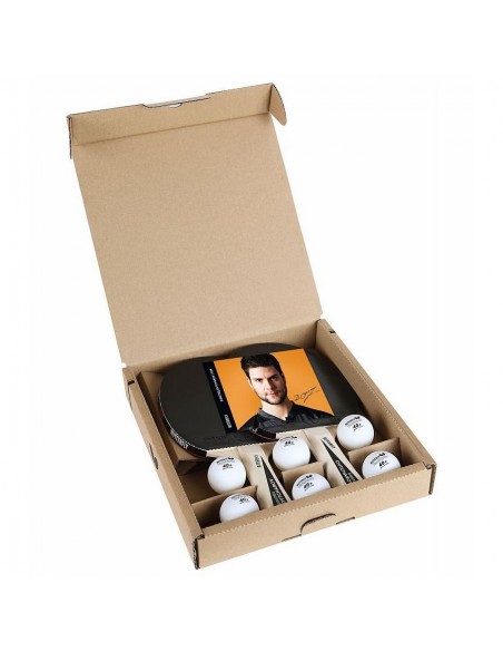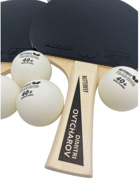 Zestaw dwóch rakietek z okładziną Addoy o grubości 1.5 mm (atest ITTF) i uchwytem wklęsłym oraz sześciu plastikowych piłeczek treningowych 40+. Całość pakowana w karton. Dołączone zdjęcie Dimitrija Ovtcharova z autografem. Idealna propozycja na prezent. Wymiary zewnętrzne kartonu: 26 x 27 x 4,8 cm.