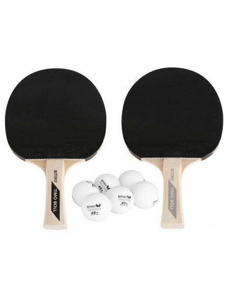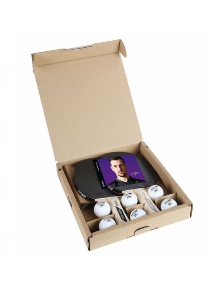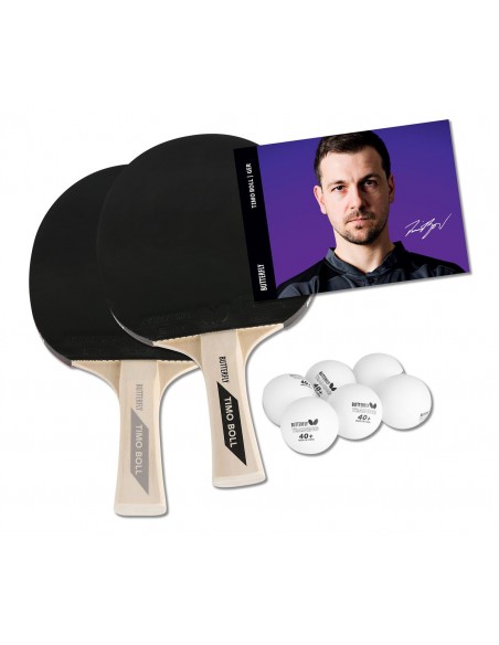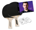 Zestaw dwóch rakietek z okładziną Pan Asia o grubości 1.5 mm (atest ITTF) i uchwytem wklęsłym oraz sześciu plastikowych piłeczek treningowych 40+. Całość pakowana w karton. Dołączone zdjęcie Timo Bolla z autografem. Idealna propozycja na prezent. Wymiary zewnętrzne kartonu: 26 x 27 x 4,8 cm.
