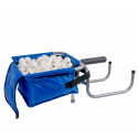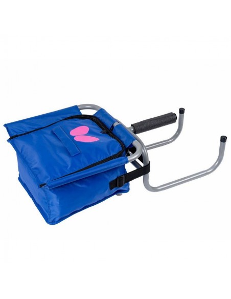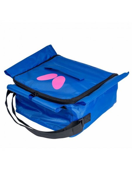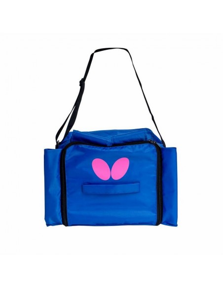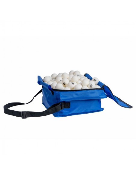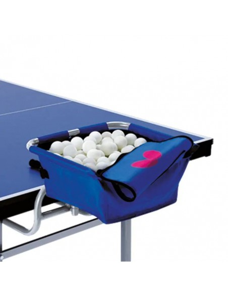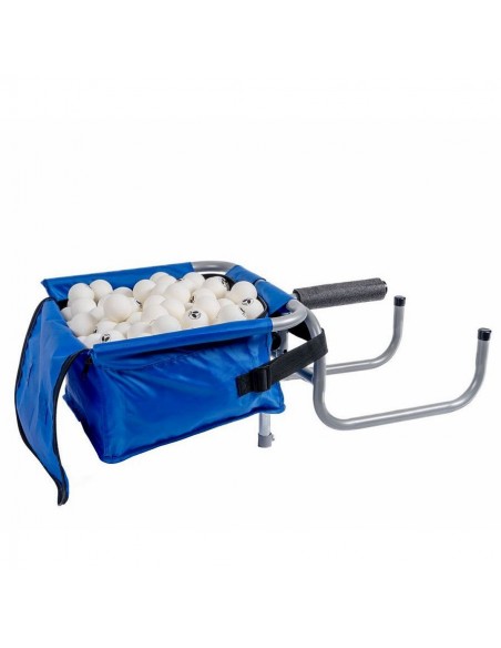 Koszyk na piłki składający się z zapinanej na zamek torby i metalowego stelaża z regulacją, umożliwiającego montaż do stołu. Ułatwia trening na wiele piłek i ćwiczenie serwu. Torba jest wyposażona w pasek do noszenia i pomieści około 100 piłek (piłki nie są dołączone do produktu).