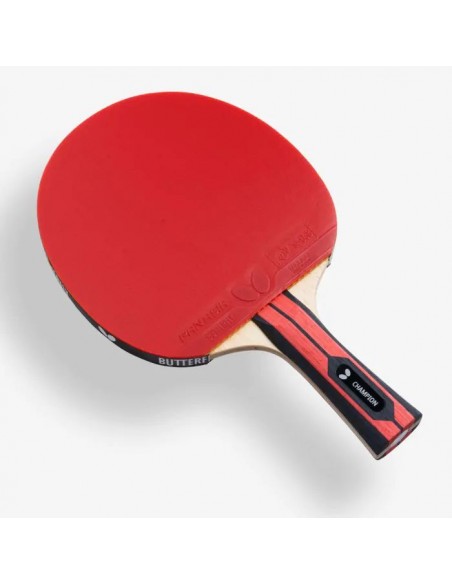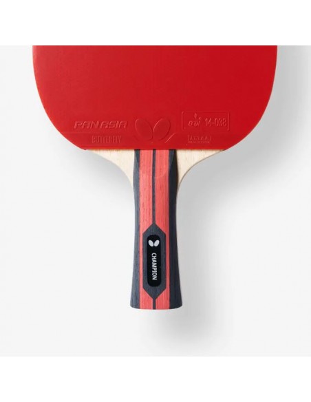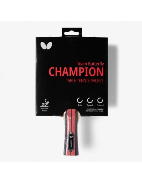 Najwyższy model kolekcji Team Butterfly, rakietka Champion jest przeznaczona do szybkiej gry ofensywnej z rotacją. Została wyposażona w okładziny Pan Asia o grubości podkładu 1.9 mm z atestem ITTF. Charakteryzuje się elastycznością i przyczepnością, niezbędnymi do nadawania piłce rotacji podczas szybkich uderzeń. Dostępna wyłącznie z uchwytem wklęsłym.
